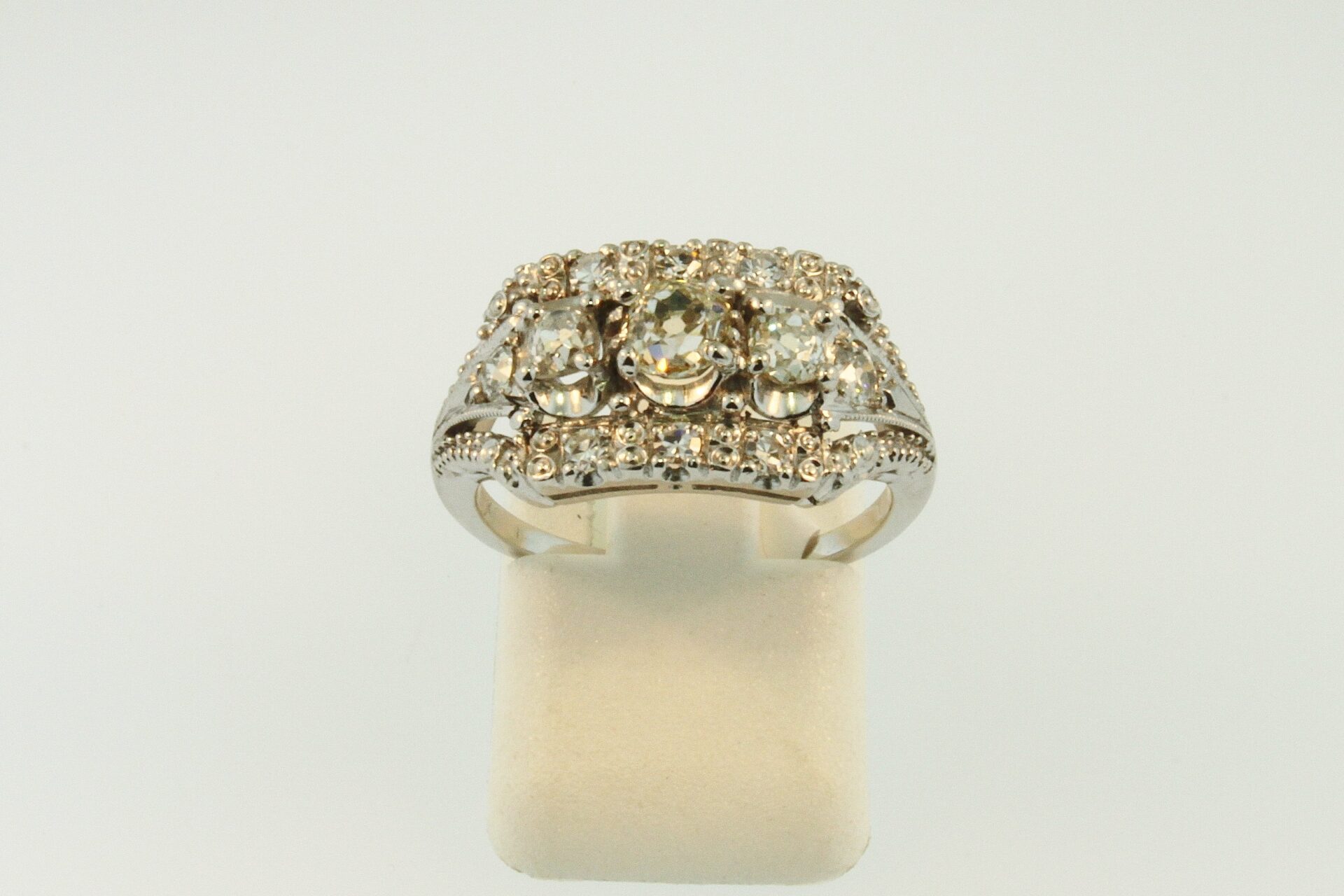 18k white gold. Center row is three old mine cut diamonds weighing in total .76 ct. Clarity SI1-SI2. Color H-M. Two bead set diamonds weighing in total .11 ct. Clarity SI2-I1. Color G-H. Two outside rows, six bead set single cuts weighing in total approximately .18 ct. Clarity VS2-SI1. Color G-I.