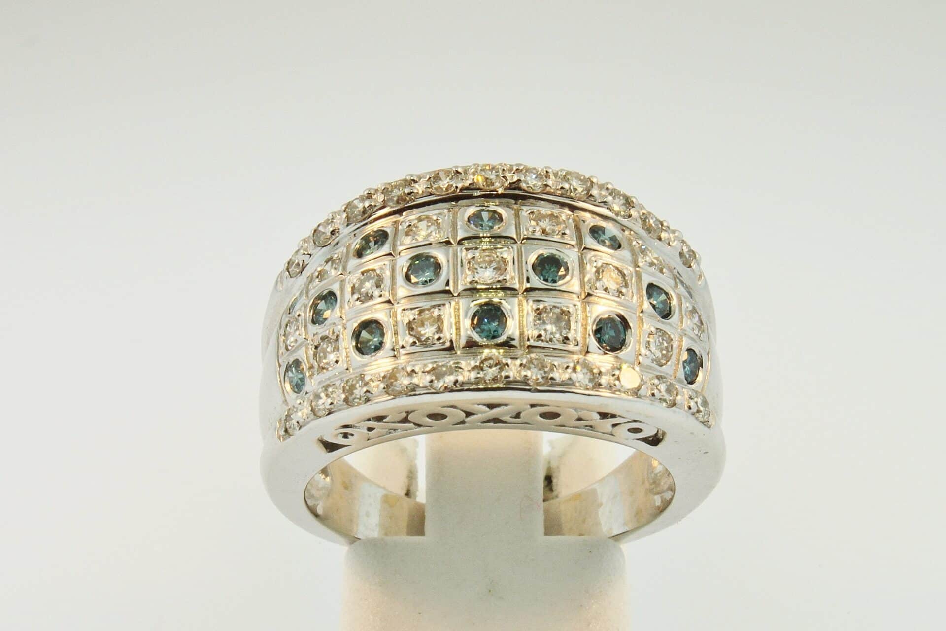 18k white gold. Round brilliant white and blue (treated) diamonds weighing in total approximately 1.25 ct. Clarity SI1-2. Size 9. Total approximate gold weight 7.5 dwt.