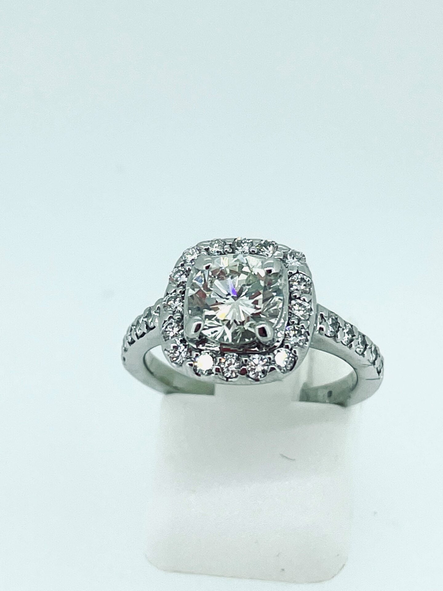 14k white gold. The center diamond is a round brilliant diamond weighing 1.07 ct. Clarity SI2. Color I. GIA certified #2151366020. Halo mounting diamonds weigh in total approximately .52 ct. Clarity SI1. Color G-H. Size 5.