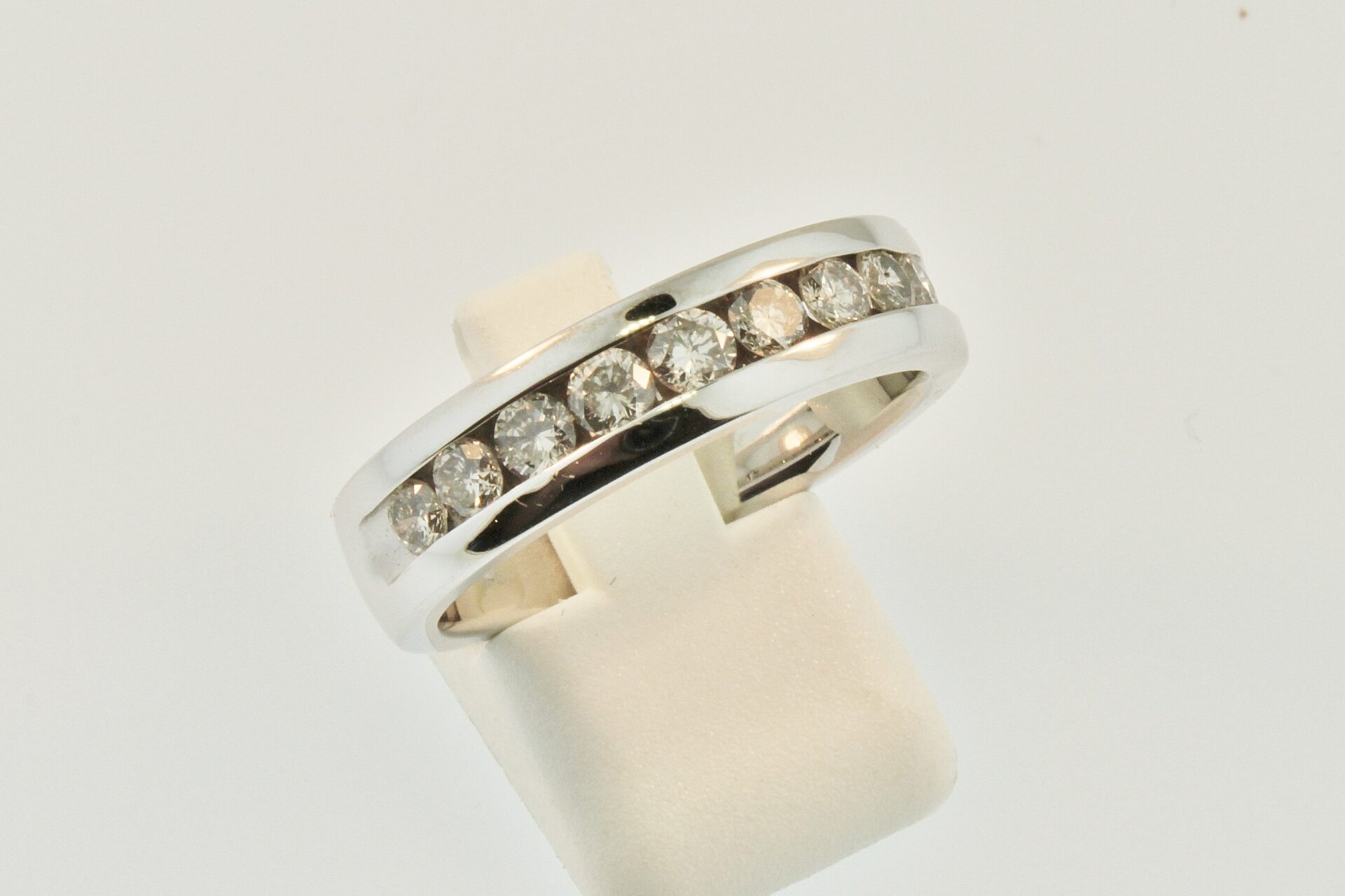 Mens 14k white gold. Channel set are 9 full cut diamonds weighing in total approximately 1.00 ct. Clarity SI2-I1. Color J-L. Size 10. 5.75 mm wide. Total approximate gold weight 6.5 dwt.
