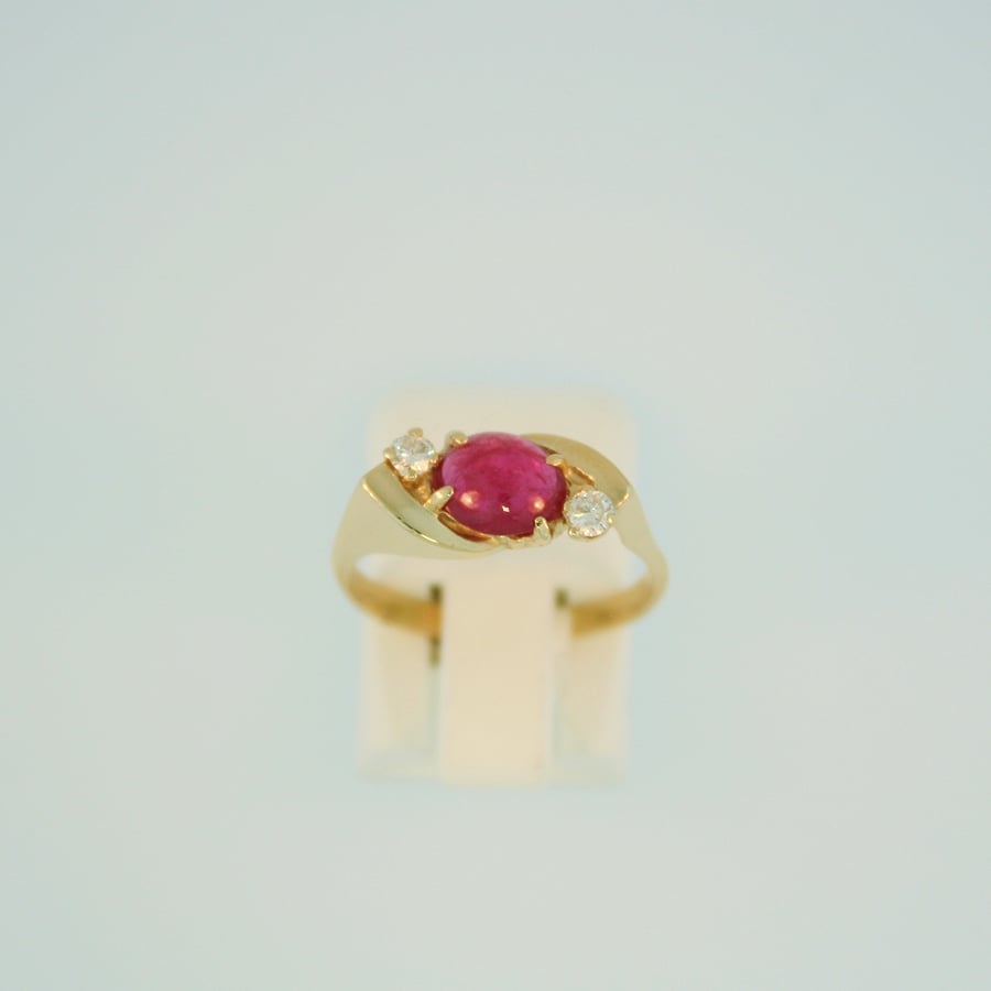 14K yellow gold. 7 m.m. x 6 m.m. oval cabochon ruby. Actual weight 1.50 ct. Two full cut diamonds weighing in total approximately .24 ct. SI2 clarity. H-I color. Size 6 1/2 Total approximate gold weight 1.7 dwt.